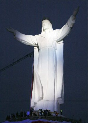 The eyes of the statue glow in the dark, thanks to a special radio based color (a glow in the dark chemical element). It weighs three tons.