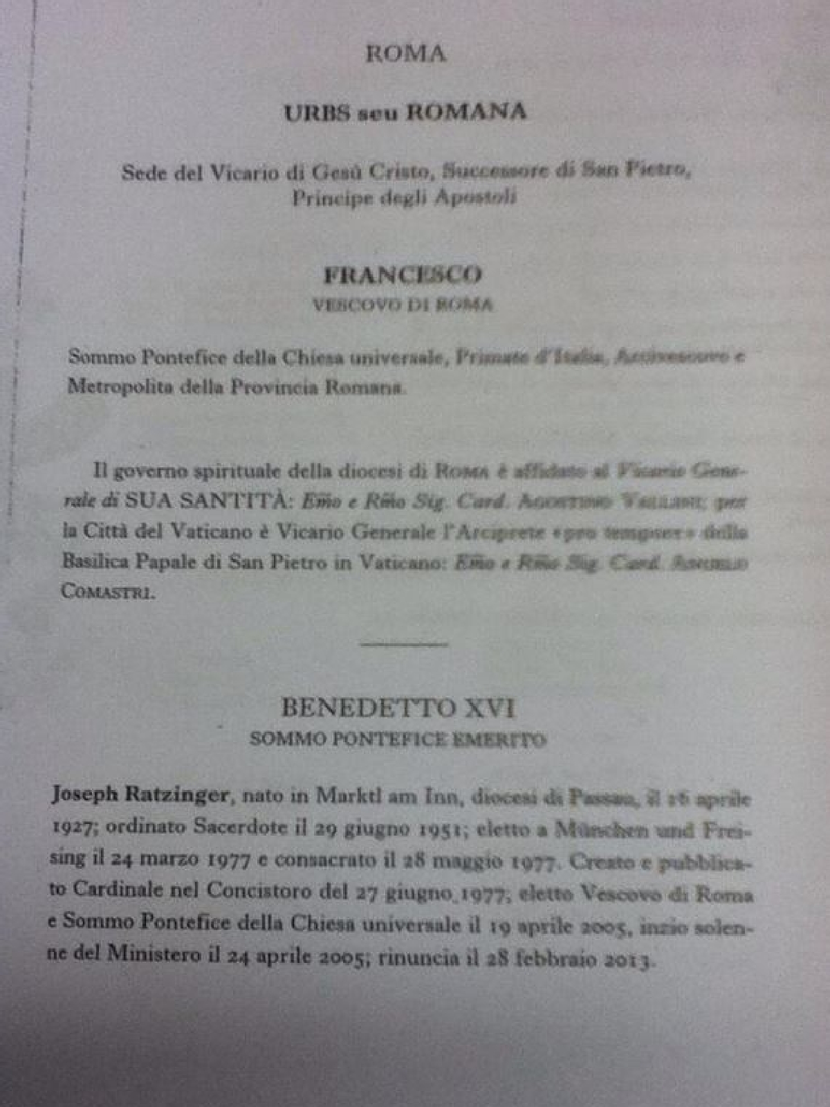The 2013 edition of the Annuario Pontificio is also the first since the directory's beginning in the year 1716 to feature a description of a retired pope, Benedict XVI, who is titled as "supreme pontiff emeritus."