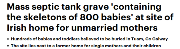 The Irish Mail on Sunday reports that the bodies of nearly 800 young children are believed to have been interred beside the former mother and baby home in Tuam, Co Galway.